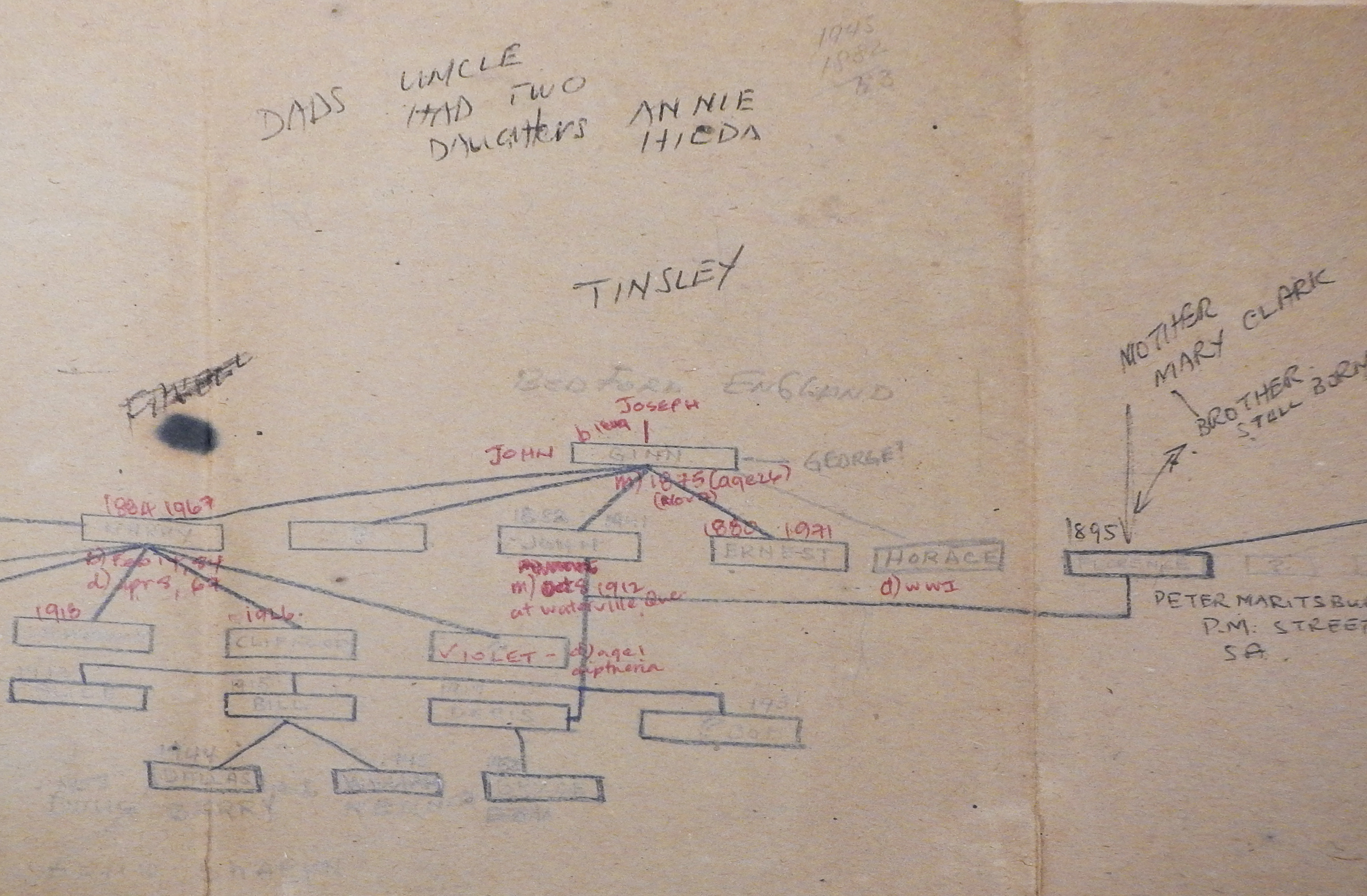 His notes are in black ink and pencil and he had worked out a rough descendancy shown by the blue frames.