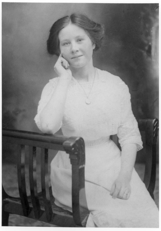 Florence (Eccles) Ginn as a Young Woman. (Undated; It may be her wedding day, she is wearing a ring. If so, she is just 17.)