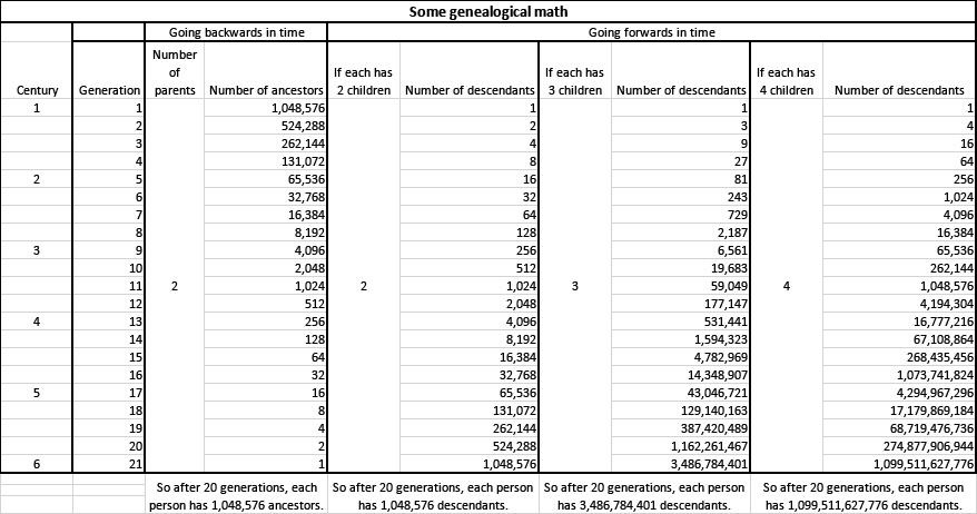 See this represented in a different way by looking at some genealogical math. That's right, starting from a single individual, if each generation has three children, and they all survived to have children, there would be about 3.5 BILLION descendants. And if each has four children, there would be a TRILLION descendants after 20 generations or the span of about five hundred years, give or take, if each generation was 25 years on average!