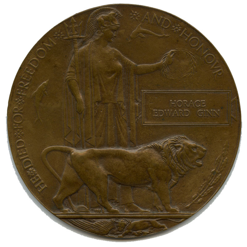 The Memorial Plaque honouring Horace Edward Ginn. It is about 4-3/4" in diameter.