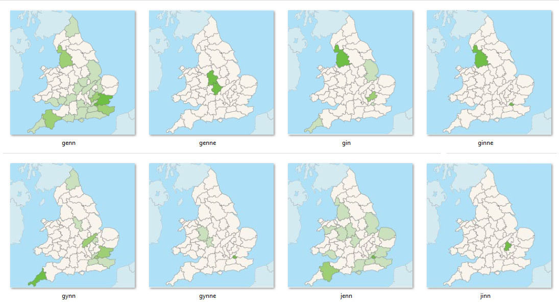 Here are some other maps showing different forms of the 'Ginn' name and where they occur most frequently. (Maps for 1891 from Ancestry.co.uk)