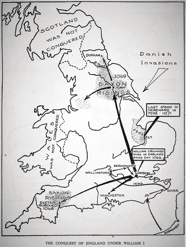 "By 1068 a series of uprisings or rebellions in the north were undertaken, in turn, led by Eadgar the Aetheling ... William’s response was resolute with the Conqueror resorting to terror tactics. Late in the year 1069, he fought his way into Northumbria and occupied York, buying off the Danes and devastating the surrounding country in his well-known ‘Harrying of the North’. He spent the winter of 1069-70 laying waste all before him, until all resistance was ended". (9)