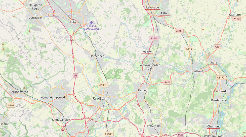 OSM Map showing Welwyn at just right of centre. Locations mentioned are underlined in red. |