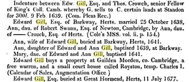 Edward was the son of Edward Gylle (Gill) of Bandon's and Anstey (bur 29.10.1642; Will proved 1643) who married Mary Mitchell (b c1585, bur 30.11.1675, daughter of Edward Mitchell (of Standon), widow of Richard Smartfoote of Puckeridge).