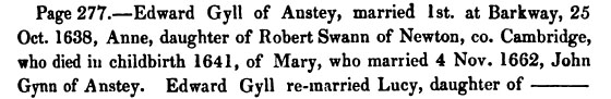 Mary Gill was the daughter of Edward Gill (Gyll) of Anstey and Ann Swann (b 1610?, see note). They were married at Barkway on 25 Oct 1638. Ann was the daughter of Robert Swann and Ann Crouch of Newton, Cambridgeshire. She died in childbirth of Mary in 1641. Mary had an older sister, Ann, who was born in 1639.