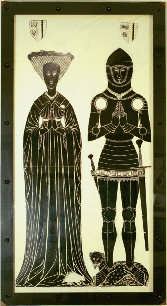 From Horowitz. 2002. Sir John is completely encased in plate. His sword belt, richly decorated, is clasped across his hips. He wears a misericorde, gauntlets and a collar of SS. His feet rest upon a leopard, unlike most brasses of men that have lions at their feet. His wife, Joan, has perhaps the most unusual headdress found on a brass. Her hair is curiously plaited and top-heavy, with a coverchef in folds at the top. Her gown is drawn at the waist by an ornamented band, and her folded collar, which falls back on her shoulders, has the popular symbol of the swan, adopted by the Lancastrian royal household as a badge since the days of Alianore de Bohun and her sister, Mary. Joan's gown falls to the ground at the sleeves, exposing the kirtle beneath. At her feet is a hedgehog, the only figure of its kind depicted on an English brass. This was undoubtedly a play on her maiden name, Risain or Arisain, from the French Herisson (hedgehog) or Oursin (sea-hedgehog). She wears a collar of SS around her neck. John Peryent was one of those fortunate individuals who served Richard II, survived the king's demise in 1399 and became a supporter of the triumphant Duke of Lancaster, now King Henry IV, without repercussion. Sir John was born in Brittany and after arriving in England became both an Esquire of the Body to Richard II and his pennon-bearer. After 1399, he was esquire to Henry IV and Henry V and served as Master of the Horse to Queen Joan of Navarre, the second wife of Henry IV. Since Queen Joan was the widow of John, Duke of Brittany, it is likely that Peryent found favor with the royal household through her due to their common connection with Brittany. In 1411, Sir John was given the status of an Englishman and decided to settle in Hertfordshire, where in 1414 he obtained the manor of Digswell. His wife, John, daughter of Sir John Risain, was also born in Brittany. When she received her "naturalization" status, she was described in the records as one of the damsels of the queen. Indeed, on the inscription of her brass she is referred to as the chief lady-in-waiting. She died on 23 April 1415, leaving a young family of three sons and two daughters. The brass of Joan and her husband was probably completed soon after her death but definitely before that of her husband's in April 1432. Sir John provided for the endowment of a chantry (masses for the dead) at Digswell. His second son, John succeeded his father in lands and manors. The son's much smaller brass was set in a stone near that of his parents. (4)