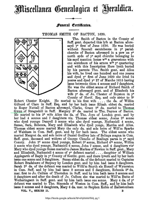 Grace, 2d daughter of Thomas Smith of Bacton (b c1521, d 01 Jun 1620!) married Thomas Gynn of Strageshill in Suffolk.