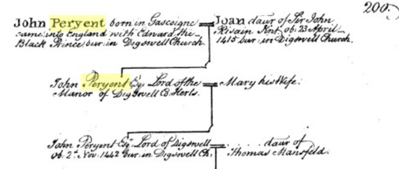 Sir John Peryent of Digswell, Hertfordshire, also Known As: "John Peryent, Lord of Digswell" was born in 1350 in Gascony, France and is said to have emigrated to England with Edward, The Black Prince.