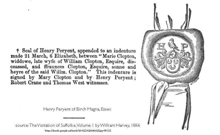 A descendant, one Henry Peryent, used a similar motif in his own seal: The year is 6 Elizabeth I or 1563. Note the bird also represented in this seal along with Henry's initials.