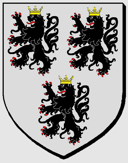 The arms of Halluin (see above) or The Lordship of Halluin except both of these have a crown, a red tongue and claws of gold and are described as: 'Argent, 3 lions sable langued gules, armed and crowned Or'.
