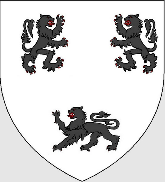 described as: Per pale, 1st argent, three lions rampant sable, 2nd, argent 7 lozenges azure 3, 3 and 1 conjoined. Motto: nos prohibeo vulnero propinquo